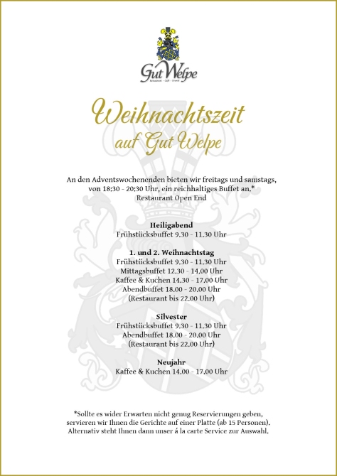 Fast 10 Jahre lang führte Familie Heyng das Restaurant „Holla die Waldfee“ auf dem Gut. Nun ist es Zeit für eine Veränderung. Getreu dem Motto „zurück zu den Wurzeln“ soll mit dem Namen „Gut Welpe“ an die Geschichte des Anwesens erinnert werden. Als Symbol der Zugehörigkeit verwenden wir das Wappen des Grafen von Merveldt in unserem Logo.